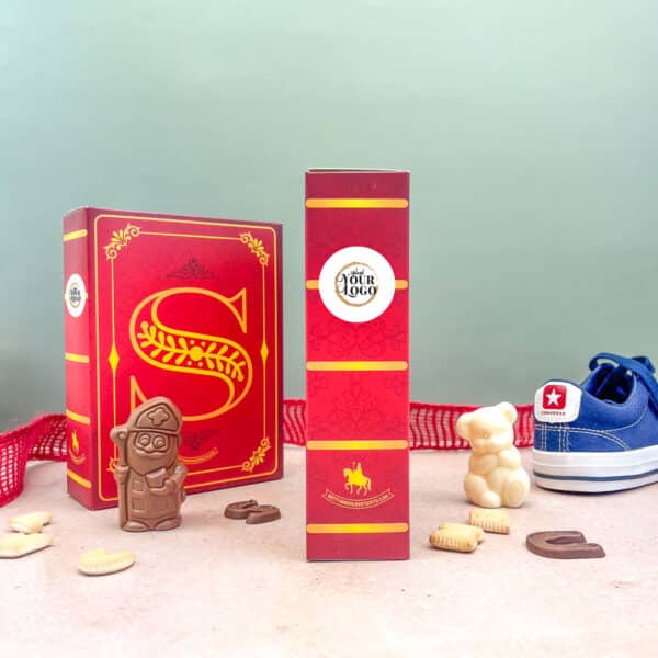 De geschenkdoos in de vorm van een sint boek met afmeting 19x14x5 cm, wordt afgewerkt met jullie logo